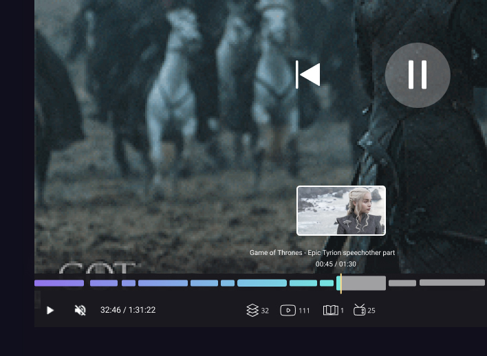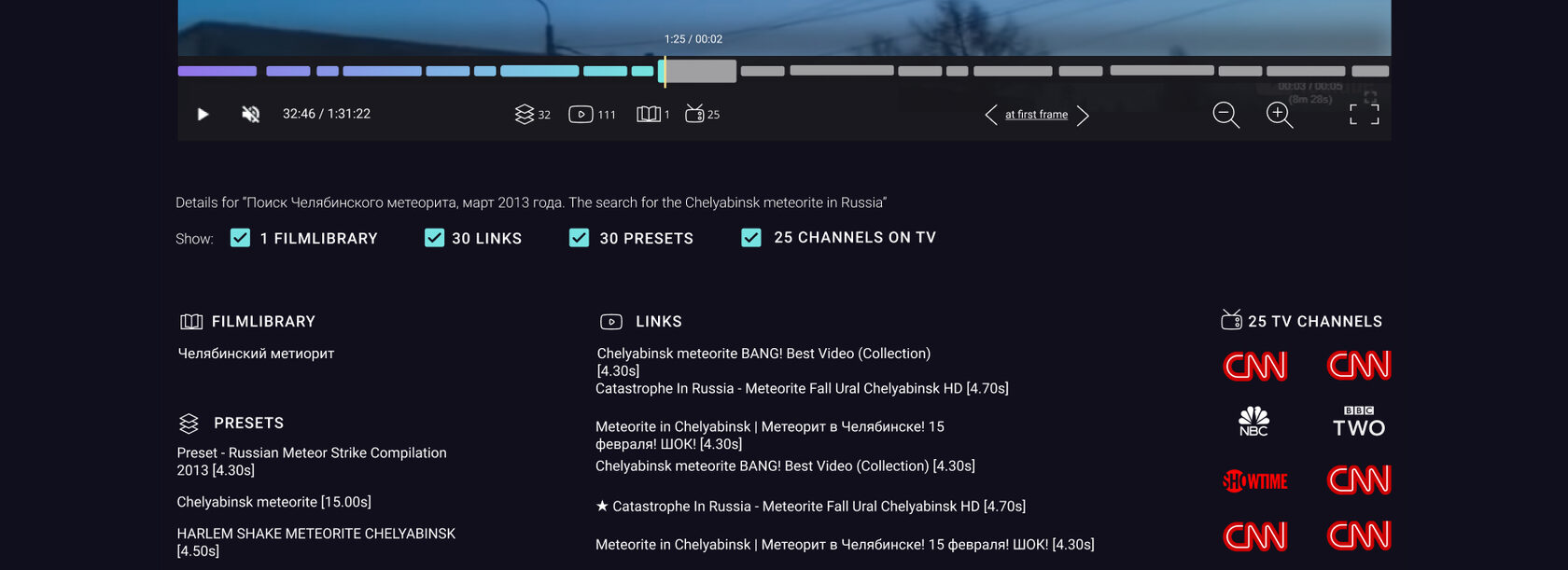 Each video fragment is associated with a bunch of presets, FilmLibrary, links, and TV channels, i.e. original sources where the system found that fragment. You can access those sources by clicking Pause and selecting the fragment you want from the list of sources that appears in the pop-up menu.